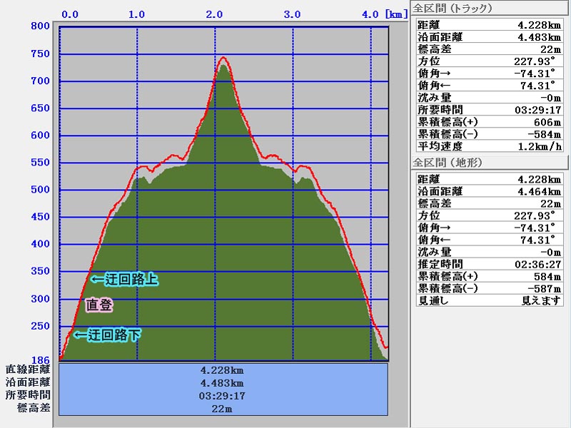 写真(No.2)にあるとおり、急登は最初からかなり上の部分まで続きます。迂回路はその内の半分程度を占めるだけです。