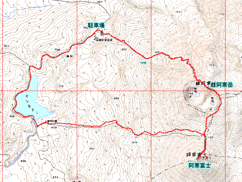 野中温泉コースで雌阿寒岳・阿寒富士に登り、オンネトーコース側に下りて一周しました。