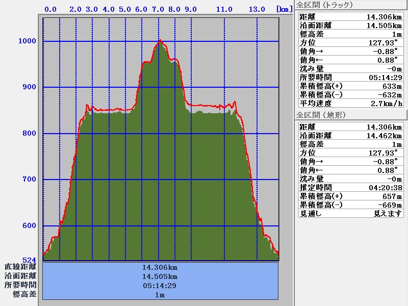 従って、今日南暑寒岳を往復していれば、総所要時間は「5時間13分+1時間53分−休憩20分」で、大体6時間46分程度と見込まれます。