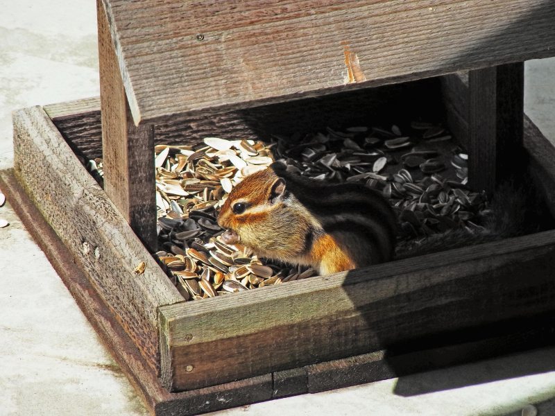 ここに、リス用のえさ箱があり、リスが2匹いましたが、体の大きい方のリスが餌場を独占していました。