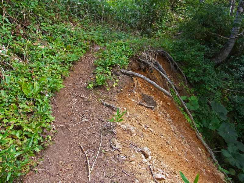 今日の登山では、笹狩りがされている部分の登山道で、刈られた笹が足に絡みついたり、10cm程残っている笹の根が登山靴に引っ掛かって非常に歩きづらい状態でした。