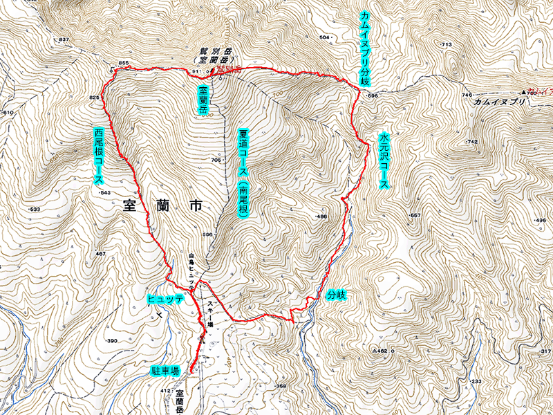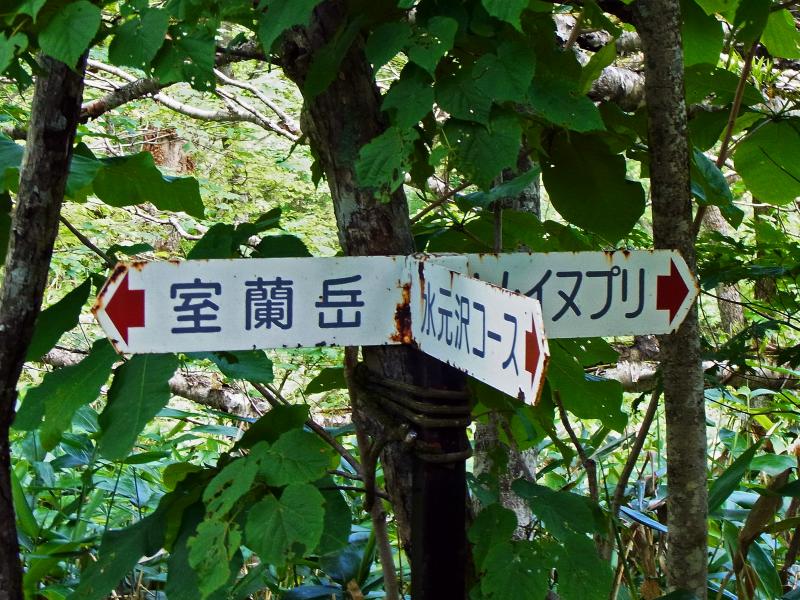 このコースは、室蘭岳からカムイヌプリに続く登山道を利用して、途中のカムイ分岐から水元沢コースに進みます。