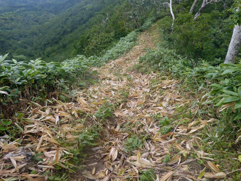 小屋から上はハッキリとした登りになりますが、下の方は最近笹狩りが行われたようで、刈られた笹がまだ青々としていました。
