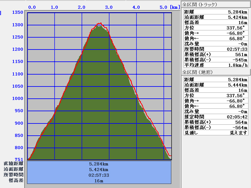 この山は、標高は1308mと結構高いですが、登山口の標高が750mもあるので、歩行距離、総上昇量とも札幌の藻岩山(慈恵会病院コース)にほぼ匹敵します。