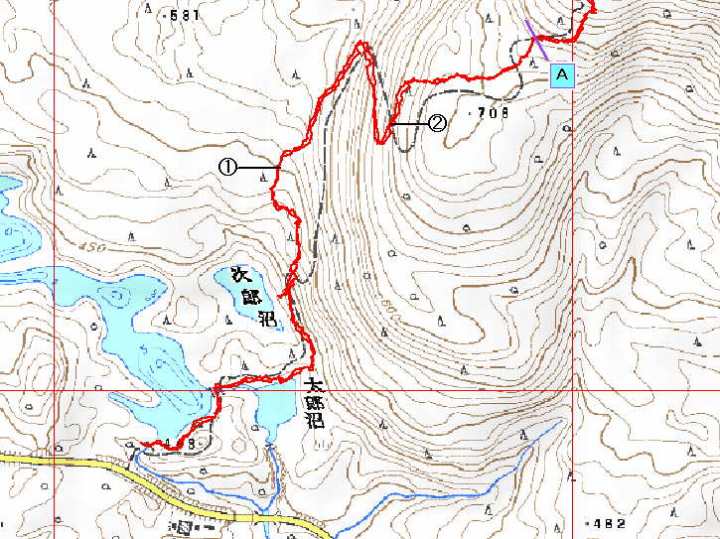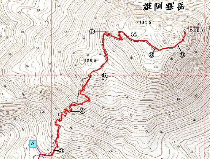 参考用に、詳細地図2枚に1合目から9合目のおおよその位置を表示しました。