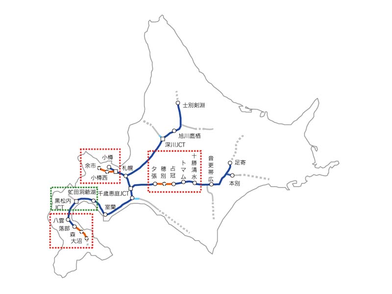 現在、占冠−夕張間(34km)が建設工事中で、平成23年にこれが完成すると、足寄−札幌間が高速道路で繋がることになります。