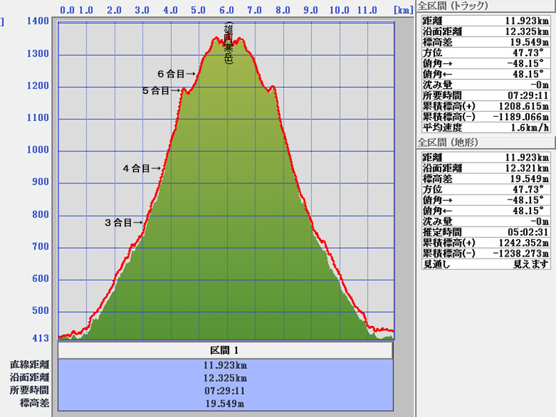 この山は上昇量(+トラック)が約1200mで、距離も約12.3kmあるので、結構登り応えがあります。