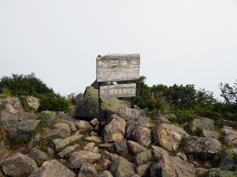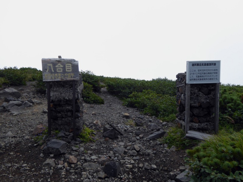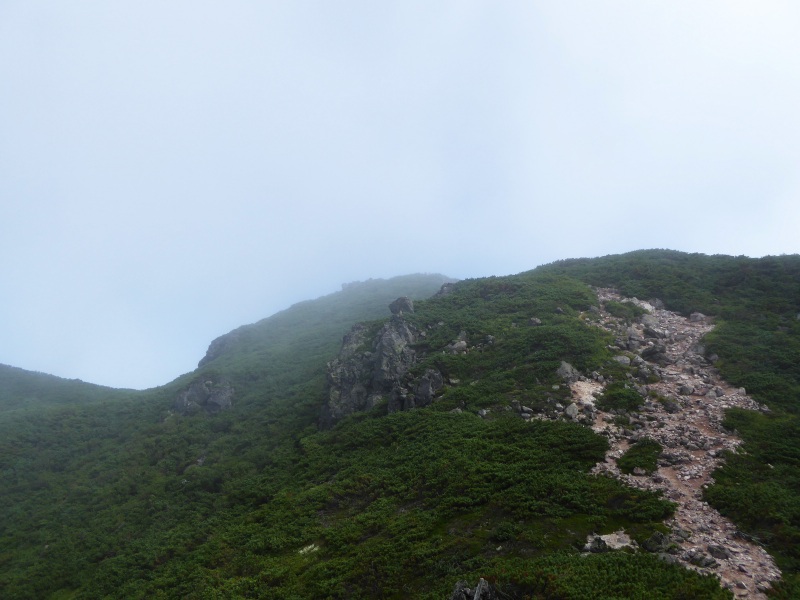 9合目で一旦少し下がり、写真4の石が露出した斜面を登って、写真奥の山頂に向かいますが距離は僅かです。(復路で視程が少し回復した時点で撮影)