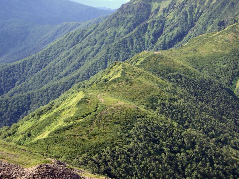 復路で使用したシュナイダーコースは、急斜面で尾根の両側が切れ落ちており、かつ起伏・段差が大きい、非常に歩きづらい登山道でした。