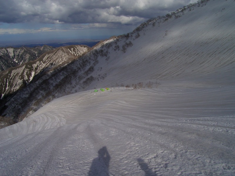 ペンギンカールは、トヨニ岳の東側にあるカールで、50m強の急斜面を下ったところにほぼ平坦な場所が拡がっており、そこにテントを張った。(5張り)