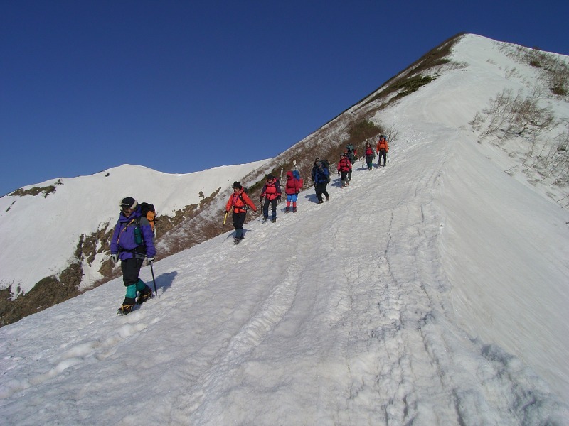 テント場から稜線までの急斜面の登りは緊張を強いられた。最後の5m程度はキックステップで登った。