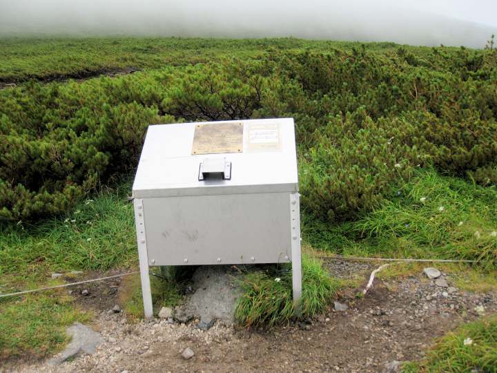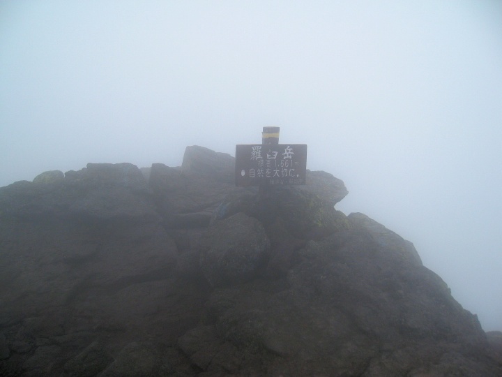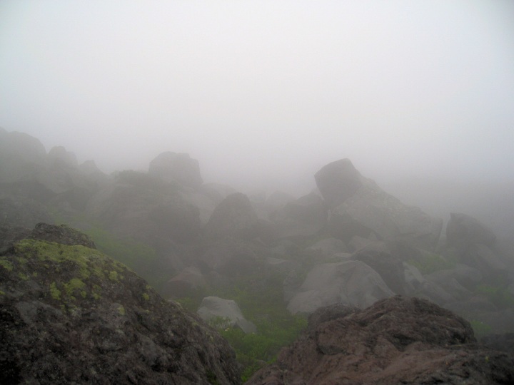 上部は濃いガスの中で展望は全く利かず、ただ登山道と標識をたよりに歩いて最後の岩場(岩稜)に達しました。