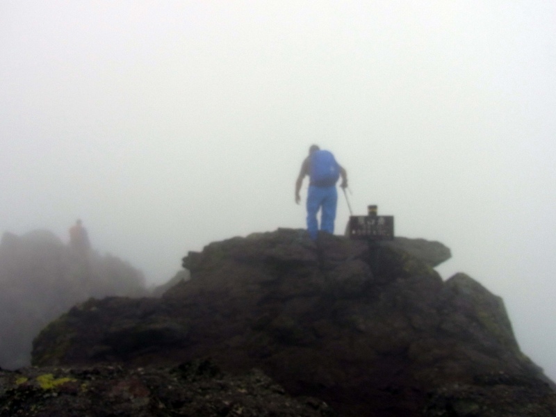 山頂も雲の中でしたので、直ぐに直下の風の当たらない場所に下りて、そこで休憩しました。