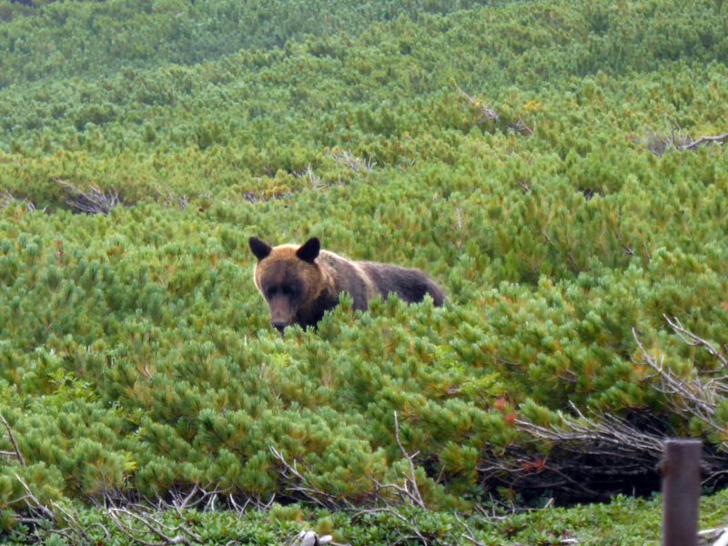 このガイドは、羅臼岳のヒグマに非常に詳しいようで、笛を吹いてヒグマを追い払いに掛かりました。