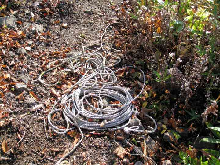 しかし、このロープは設置後かなり年数が経過しているようで、一番下のロープは取り外されて登山道の脇に置かれていました。