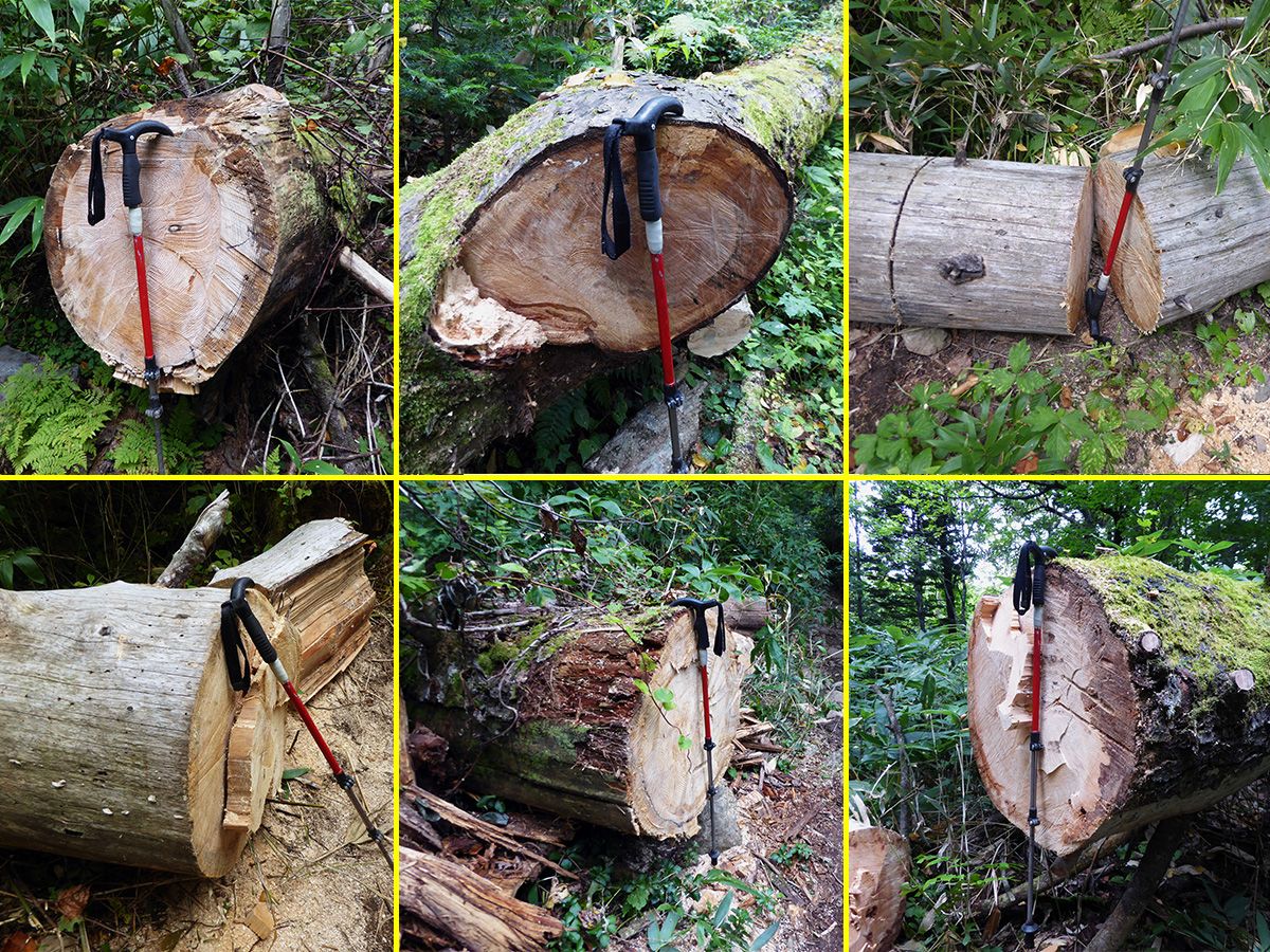 大きさが判るようにストックを一緒に写していますが、それぞれ一抱え以上もある大木ばかりです。