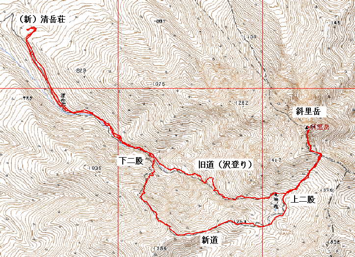 林道入り口から清岳荘までの距離表示が、車のメーターと一致しない。実際の距離は少し短いようだ。1/25000地図でもGPS軌跡と清岳荘の位置が一致していない。