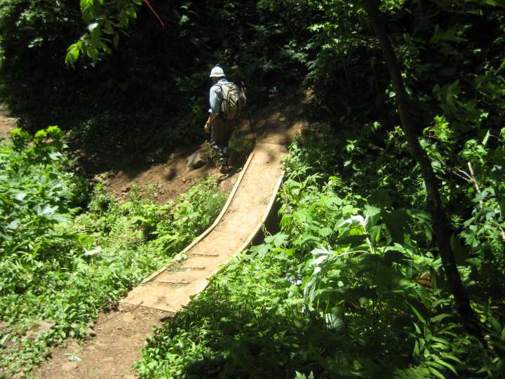 登山道の2番目と3番目の橋の上に土嚢が積まれ、その上にベニヤ板が張られていました。(下の写真参照)
