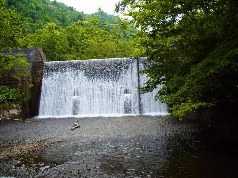 復路で砂防ダムに寄ってみましたが、融雪期で水量が多いので、水の幕が大変綺麗でした。
