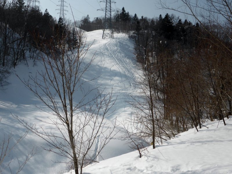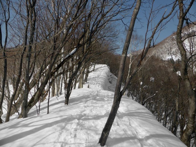 今日の登山道の状態は、暫く降雪が無かったようで、冬道の急登部分とガレ場では、スノーシューの踏み跡が広範囲に広がり、藻岩山についている様な凹型の踏み跡が全くない状態でした。