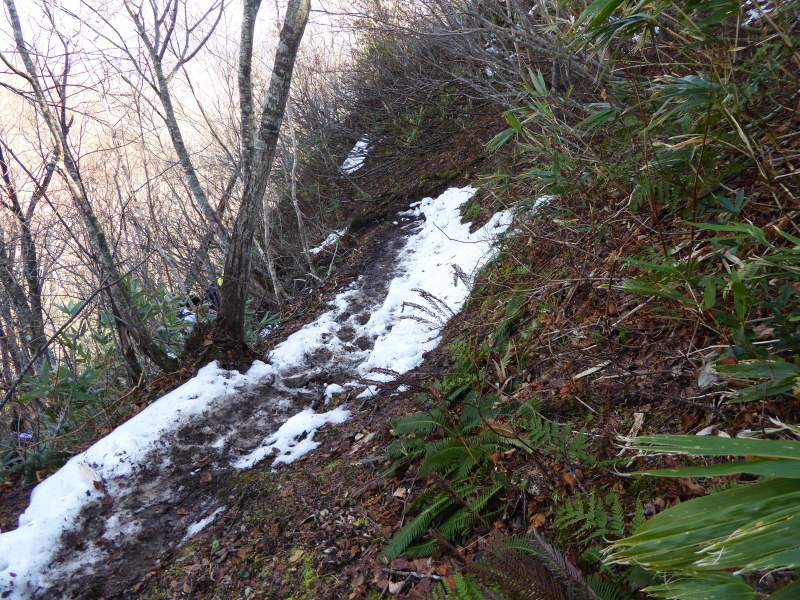 砥石山本体の日陰部分の殆どでは、登山道に雪が残っていました。(写真6)