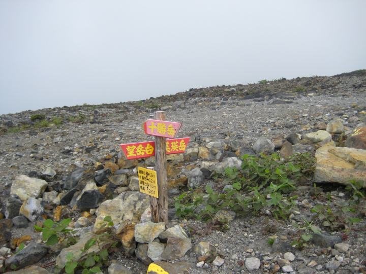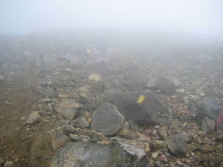 往路では雲が晴れることはなく、視程10m程度でやや強い風の中を、岩や火山灰地の登山道を慎重に歩きました。