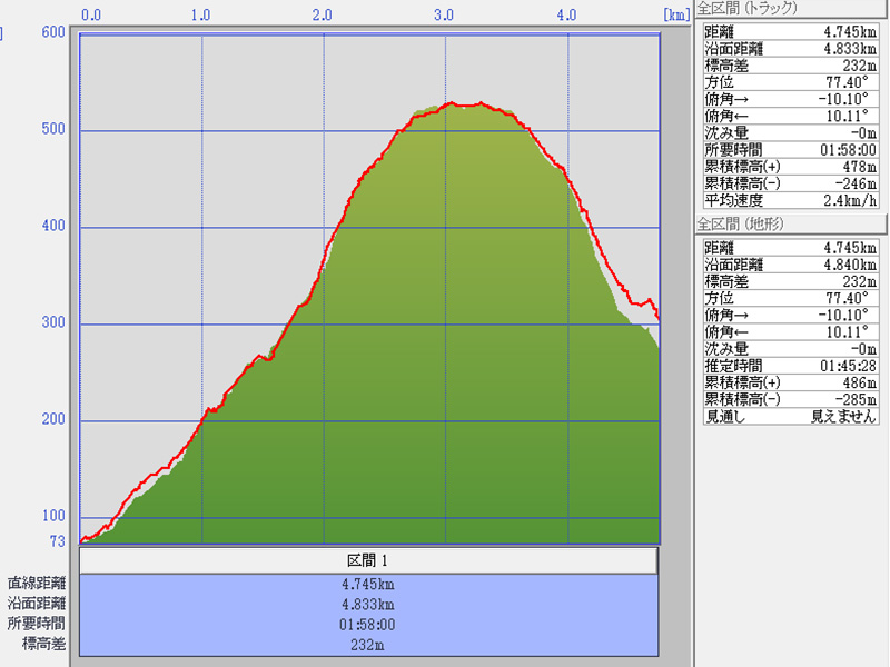 有珠コースで有珠山の展望台を往復しました。 駐車場 05時49分 展望台 06時57分 (1時間08分) 駐車場 07時55分 (0時間58分) (2時間06分) 合計所要時間 2時間06分 (GPS記録) 総上昇量 m 総下降量 m 累積標高(+)トラック m 累積標高(+)地形 m TP積算距離 km (メモ) GPS記録:あり。 ただし、復路の途中まで。 写真なし。 GPS記録 総上昇量 495m 最高高度 530m 距離 6.44km 移動 1時間47分 停止 0時間41分
