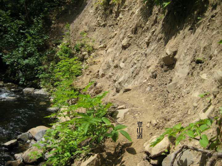 道路が湾曲して右に逸れるため、この登山標識を見逃すと