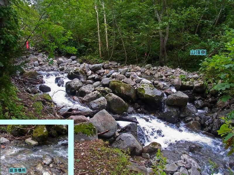 崖際についていた登山道の崩落が進んだため、河原を歩いて迂回するように経路が変更になっていました。