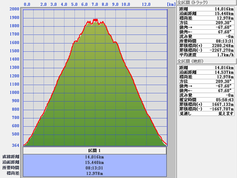 このプラスとマイナスを別々に集計するために、累積標高(+)トラックの数値が大きくなっています。